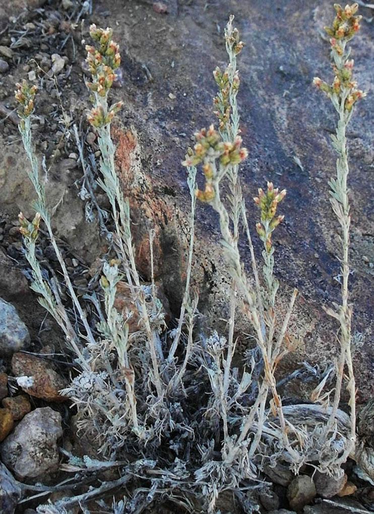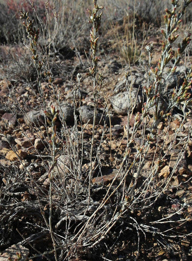 Засохшие цветоносы даже на полынь не похожи и представляют несколько гладких былинок с лохмотьями от соцветий на конце и прикреплены к ветвящейся "коряжке". В ареале обитания - ежовник усеченный, полынь белая, солянка боялычевидная. нанофитон ежовый, реже кохия простертая |