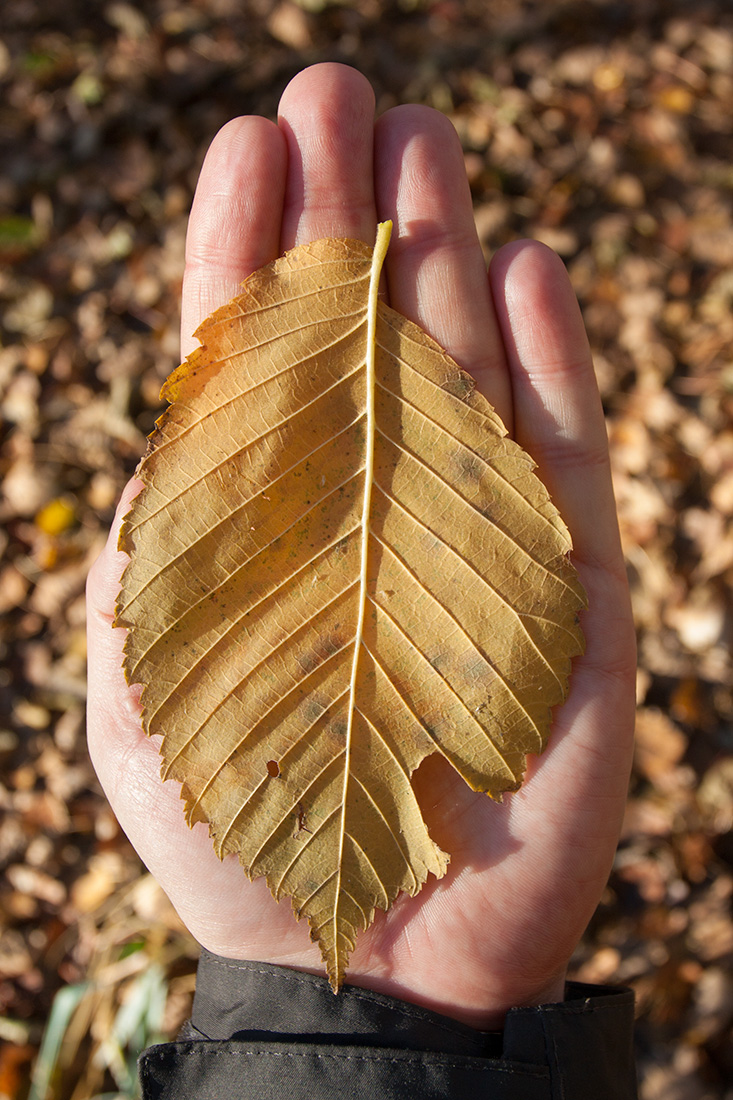 Опавший лист в осенней окраске (вид на абаксиальную поверхность). Санкт-Петербург, Кронштадтский р-н; о-в Котлин, северное побережье Финского зал. к западу от форта "Шанец", прибрежный лес с доминированием Alnus glutinosa и Salix. 21.10.2018.