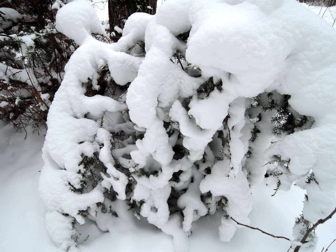 Заснеженный покоящийся куст в сосново-дубовом лесу. Беларусь, г. Гродно, лесопарк Пышки. 21.12.2018.