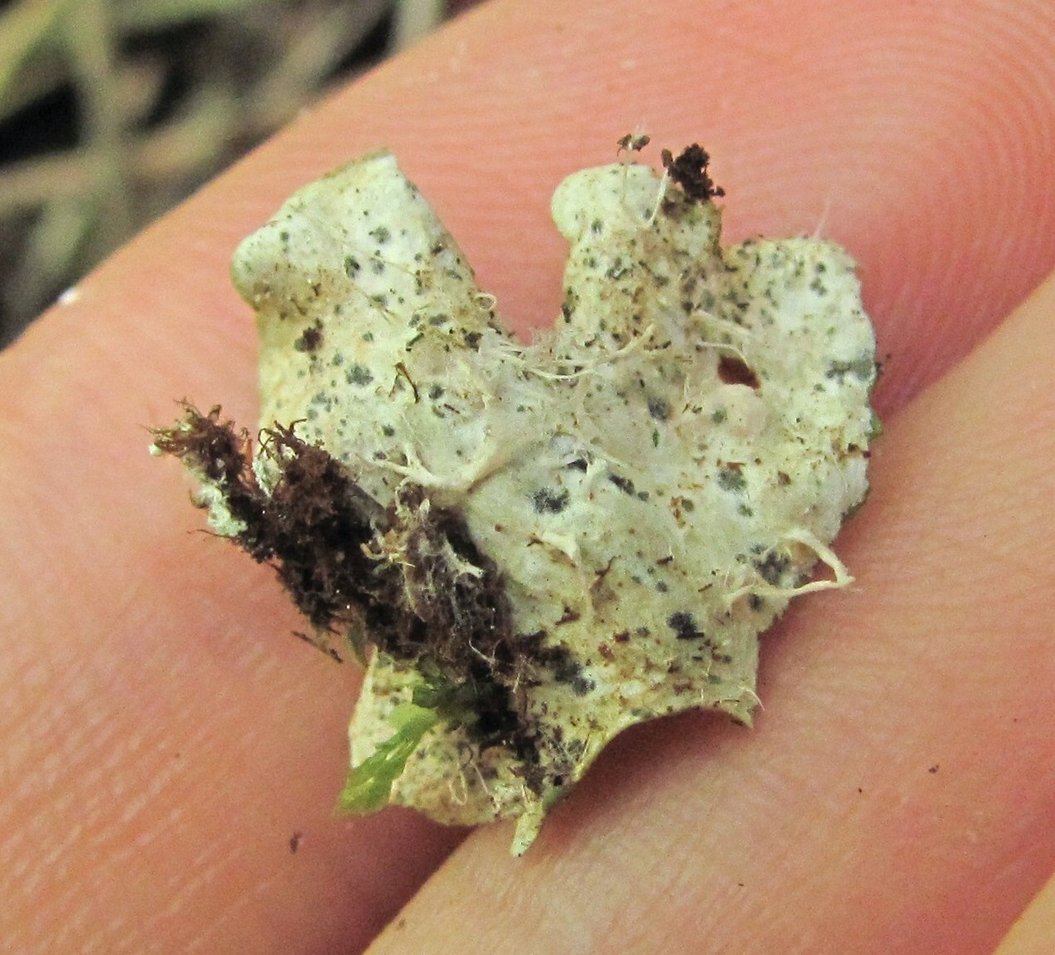 Таллом среди побегов Plagiochila. Кабардино-Балкария, Эльбрусский р-н, окр. с. Бедык, ок. 900 м н.у.м., лес, на каменистой почве. 08.08.2018.