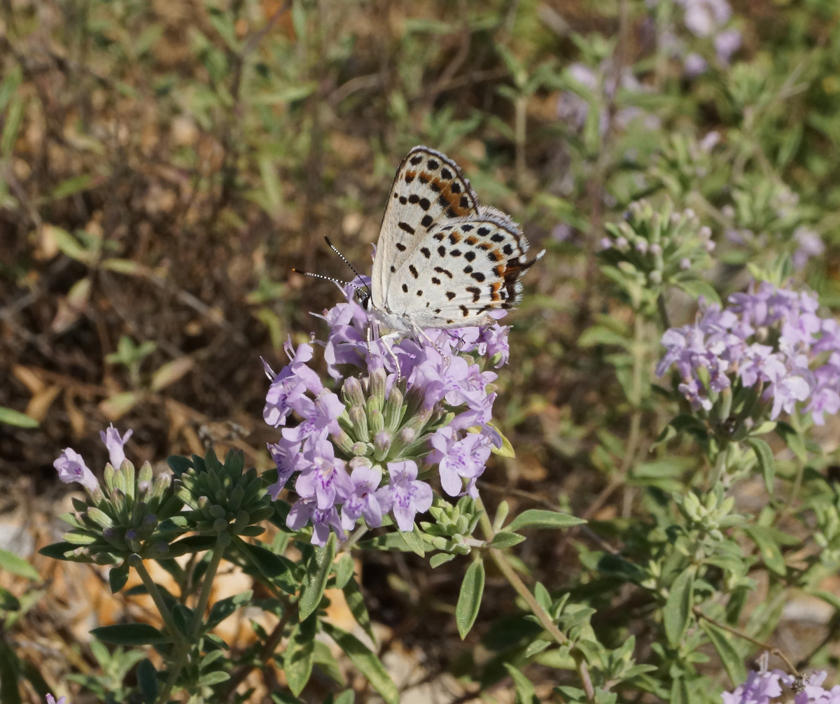 Верхушка цветущего растения с кормящейся бабочкой-голубянкой (Athamantia dimoroha [det. P.Gorbunov]). Казахстан, Восточно-Казахстанская обл., Урджарский р-н, окр. с. Барлык-Арасан, склон сопки. 21.06.2014.