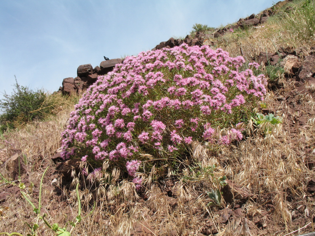 Цветущее растение с кормящейся бабочкой Vanessa cardui; на заднем плане отдыхающий ворон. Южный Казахстан, западные отроги Киргизского хр., горы Ботамойнак в окр. г. Тараз, ≈ 800 м н.у.м., каменистый склон юго-зап. экспозиции. 24 мая 2019 г.