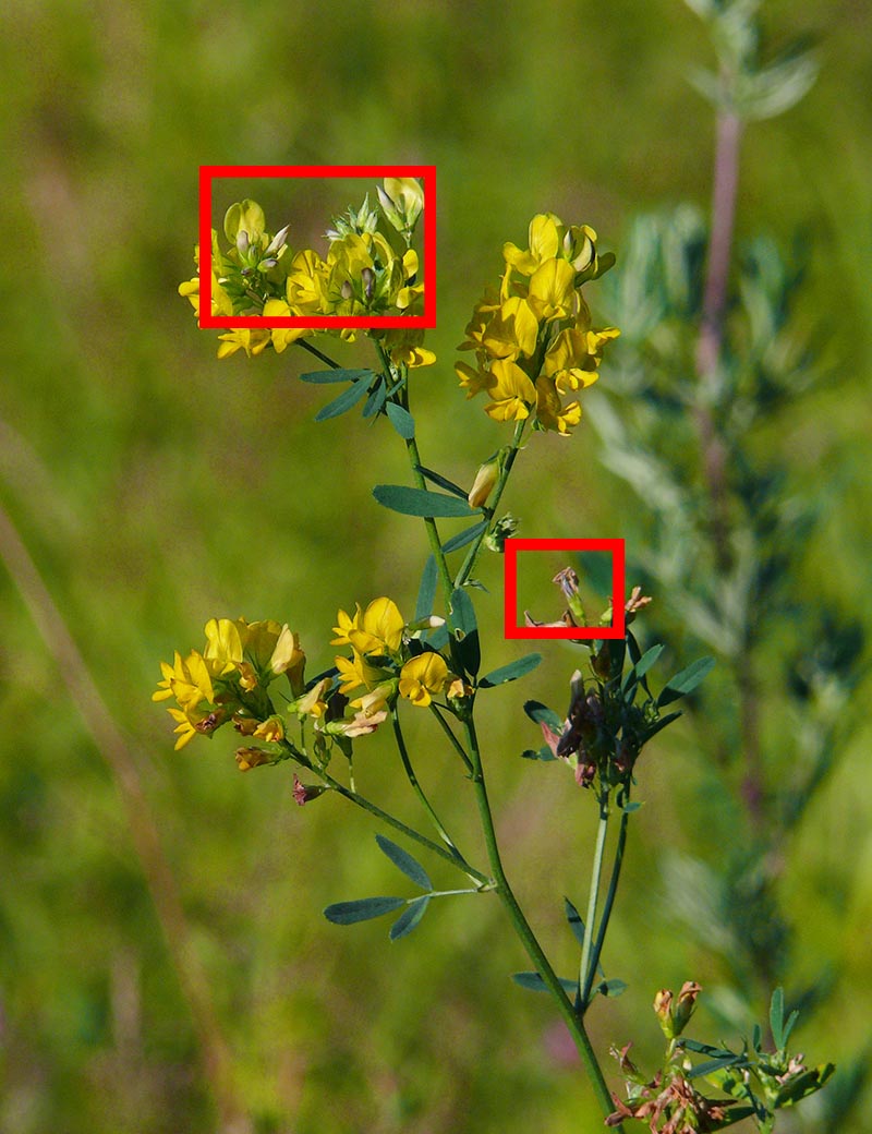 на 10 часов виден дуговидно согнутый (не спирально!) плод. Это ведёт к Medicago falcata. |