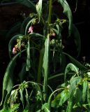 Верхняя часть цветущего расения с увядшими в жаркую погоду листьями. Красноярский край, Ермаковский р-н, пос. Танзыбей, сорное на участке. 30.07.2019.
