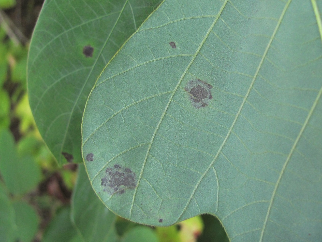 Часть листа с поражениями (вид снизу). Краснодарский край, Сочи, окр. мкр. Мацеста, под ЛЭП. 06.11.2019.