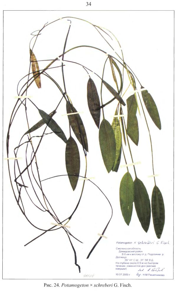 Действительно растение на фото очень похоже на P. x schreberi G. Fisch. (=P. natans x P. nodosus). Описание этого нотовида есть в книге В.Г. Папченкова "Гибриды и малоизвестные виды водных растений" (2007), где однако указано, что этот гибрид очень редкий и достоверно известен в России лишь из Смоленской области. Смущает еще и то, что для севера Восточной Европы (4 том ФЕЧ СССР) типичный P. nodosus не указан, он, вероятно, заходит лишь в Прибалтику.