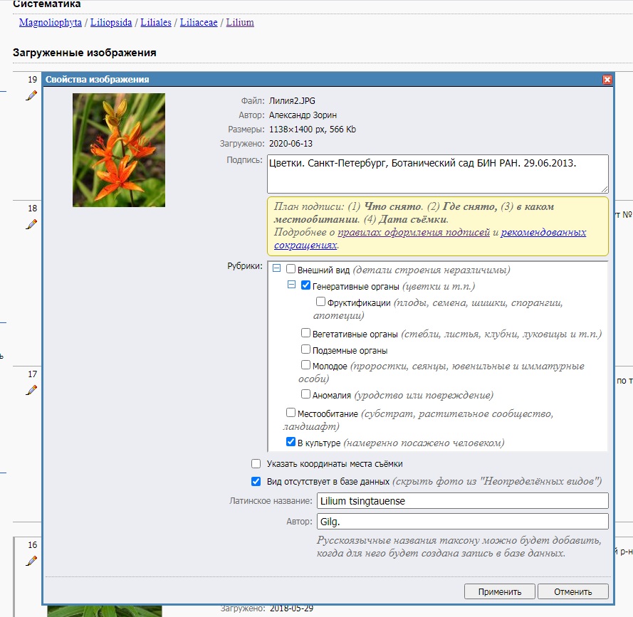 | Natalia Gamova | Если вида нет (ещё) в базе сайта, то заходите в набор изображений (в данном случае - рода Lilium, где сейчас фото хранится), и у превьюшки фото нажмите "править описание" и отметьте там галочкой пункт "Вид отсутствует в базе данных" - и заполните вид и автора - нажмите "применить"