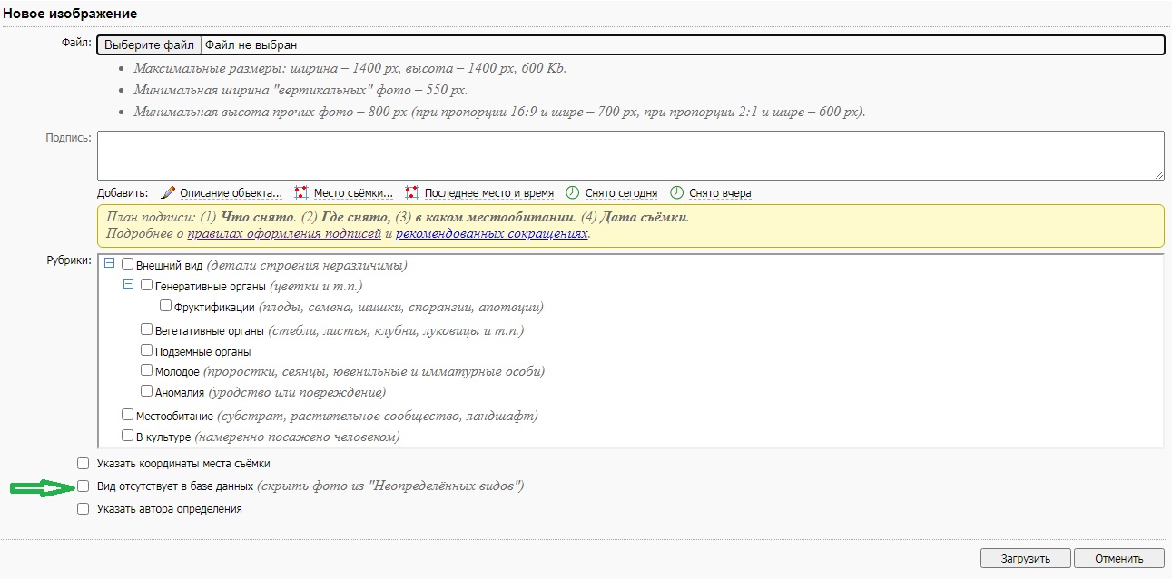 Вот как раз если нет вида - то загружаем фото на уровень рода - и там под обычным полем для подписи тоже есть возможность отметить отсутствие в базе данных