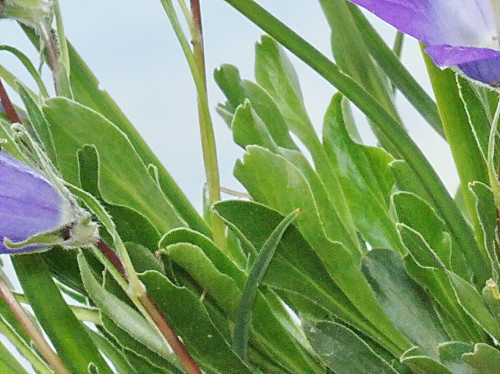 "Пришил" вырезку из выложенного следующим фото другого растения этой же популяции, где листья видны лучше.Евгений, а других ракурсов нет? Campanula_tridentata_bieb 05.jpg |