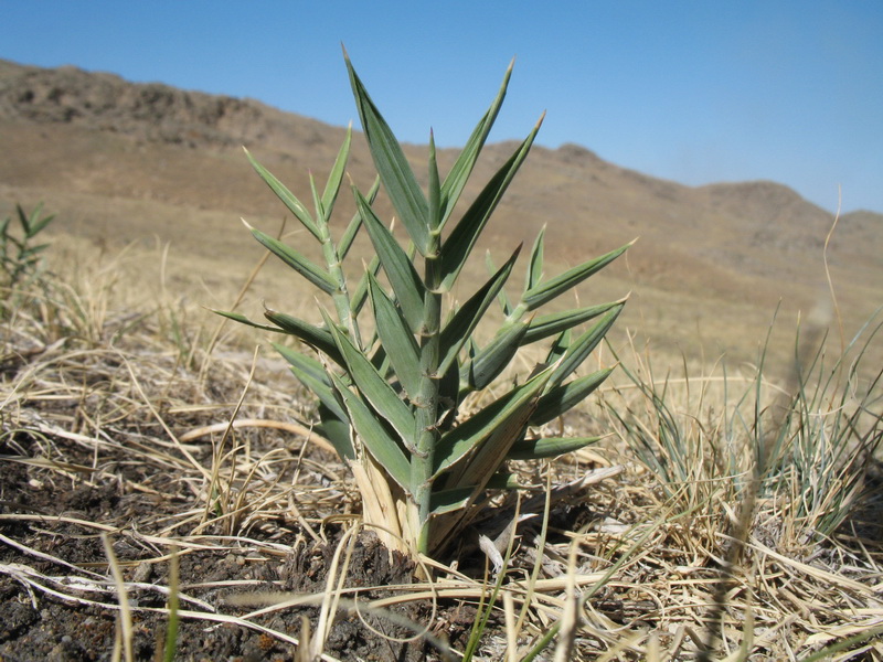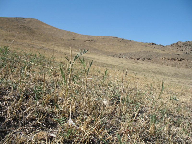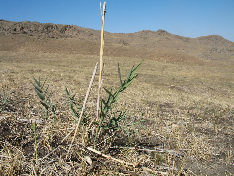 | Vladimir Kolbintsev | Здесь сухо и очень низкорослый тростник растёт от подземных побегов. В таких местах он рано высыхает, отчего и сгорел при пожаре. А там где растёт Cousinia karatavica - уже совсем сухо.