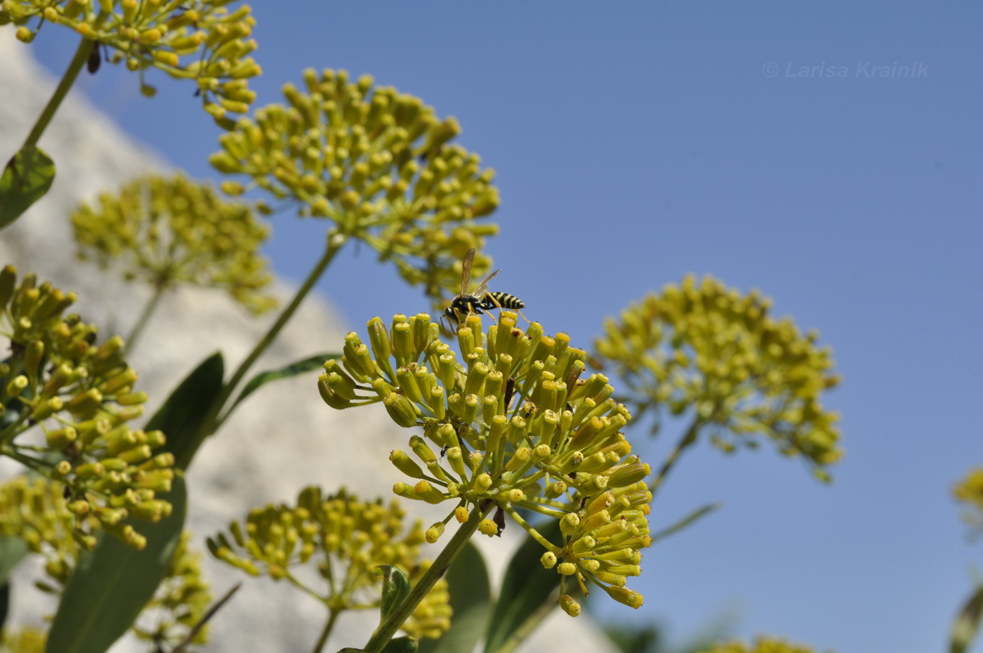 Соцветие с кормящейся осой. Крым, г. Симферополь, окр. мкр-на Пневматика; склон куэсты, скала. 29.08.2020.