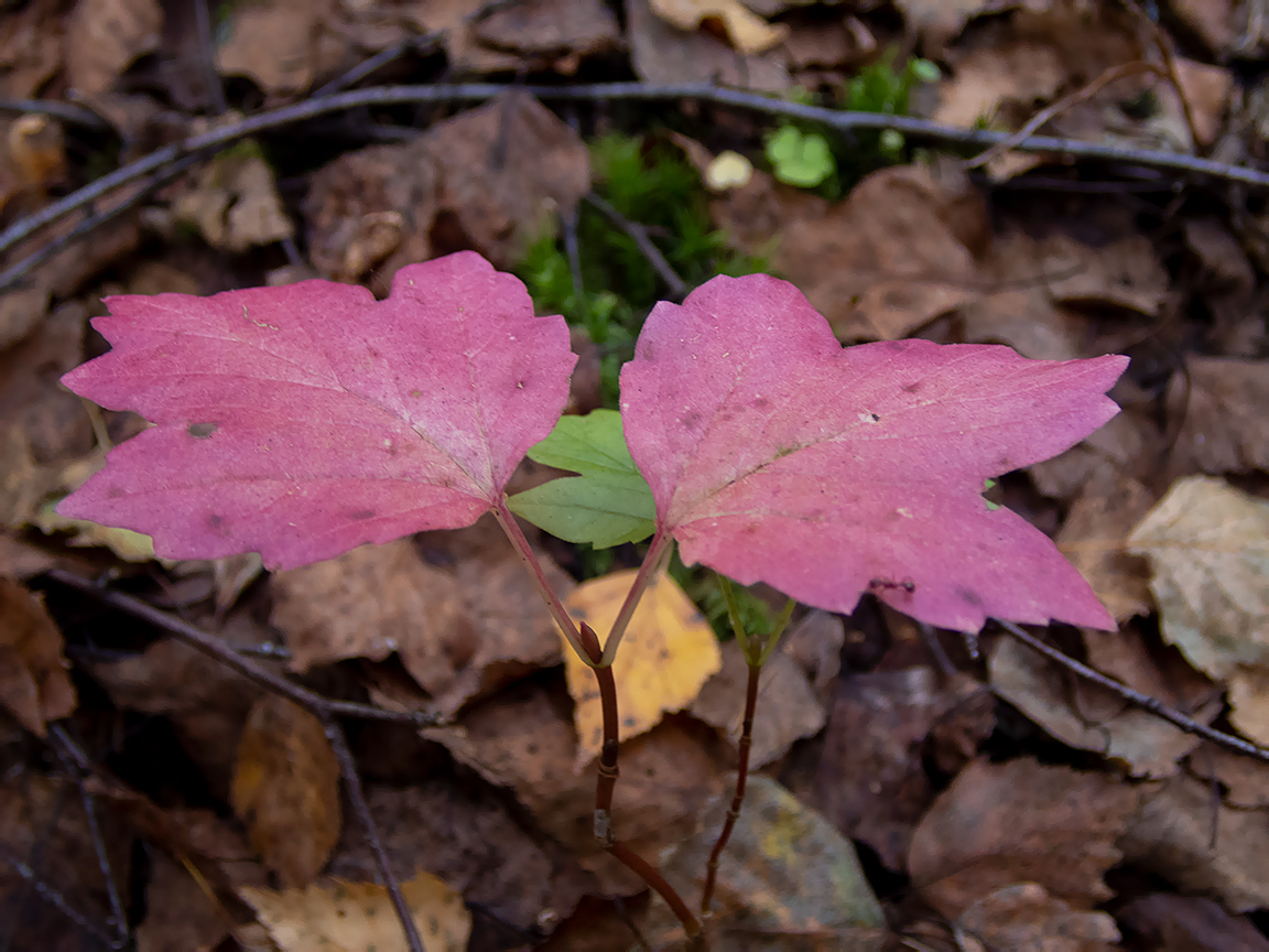 Верхушка молодого растения в осенней окраске с бегущим муравьём. Тверская обл., Кимрский р-н, в подлеске берёзово-елового леса. 24.09.2020.
