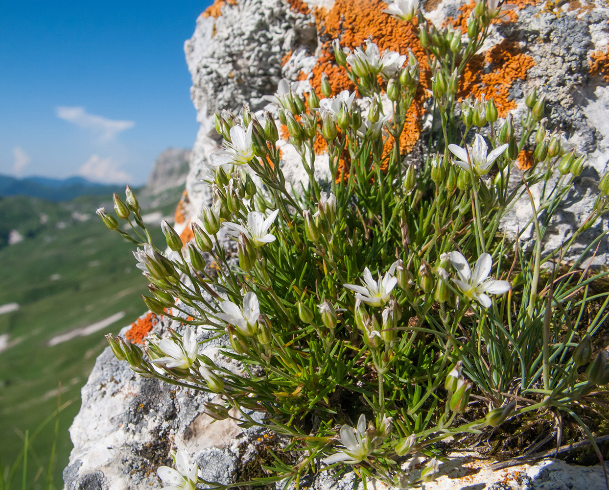 Цветущее растение. Адыгея, Кавказский биосферный заповедник, Фишт-Оштенский массив, юго-восточный отрог горы Оштен, ≈ 2100 м н.у.м., в задернованной расщелине скалы, поросшей Rusavskia elegans. 24.07.2017.