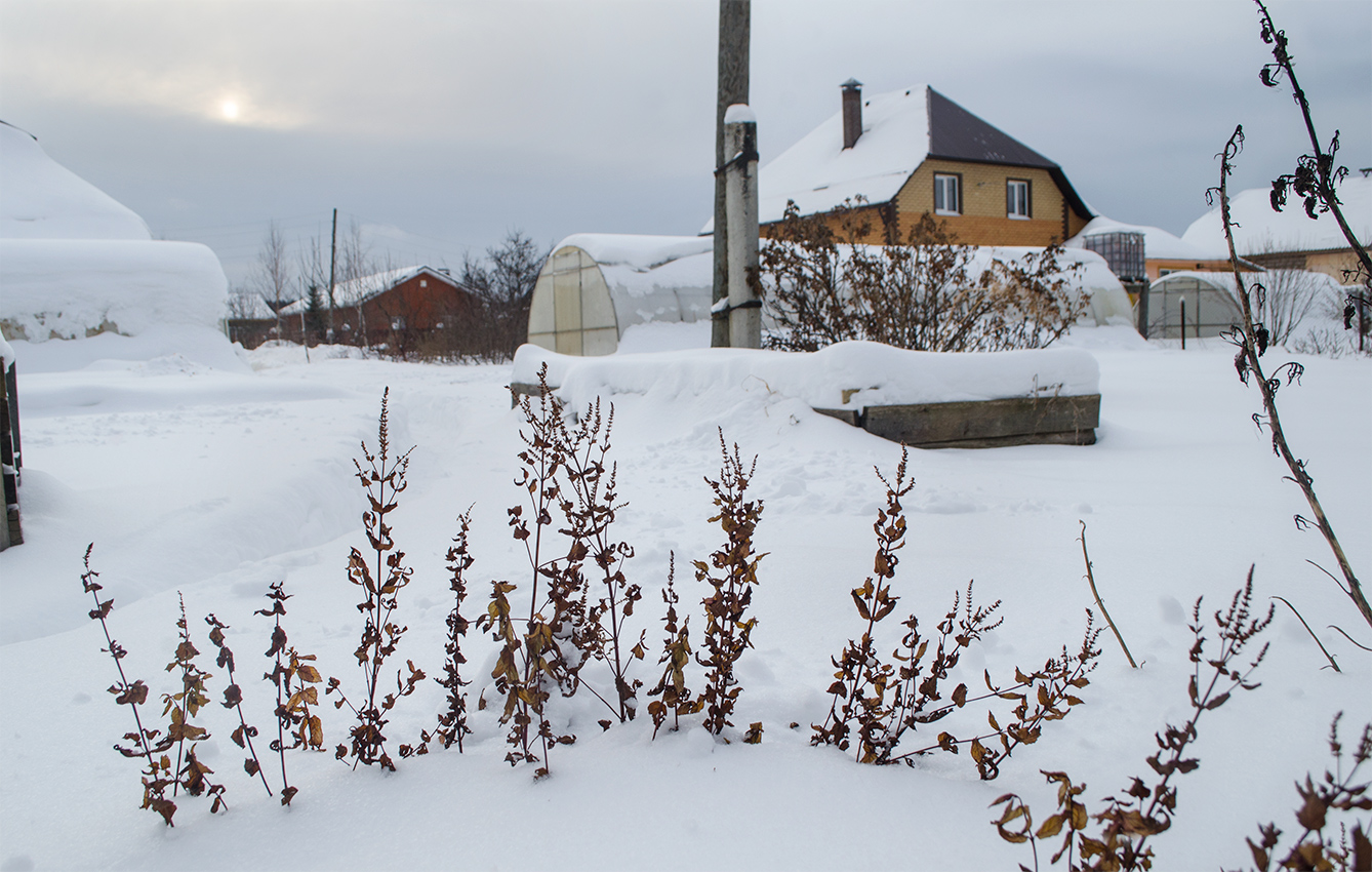 Прошлогодние сухие плодоносящие побеги. Пермский край, пос. Юго-Камский, частное подворье. 16 января 2021 г.
