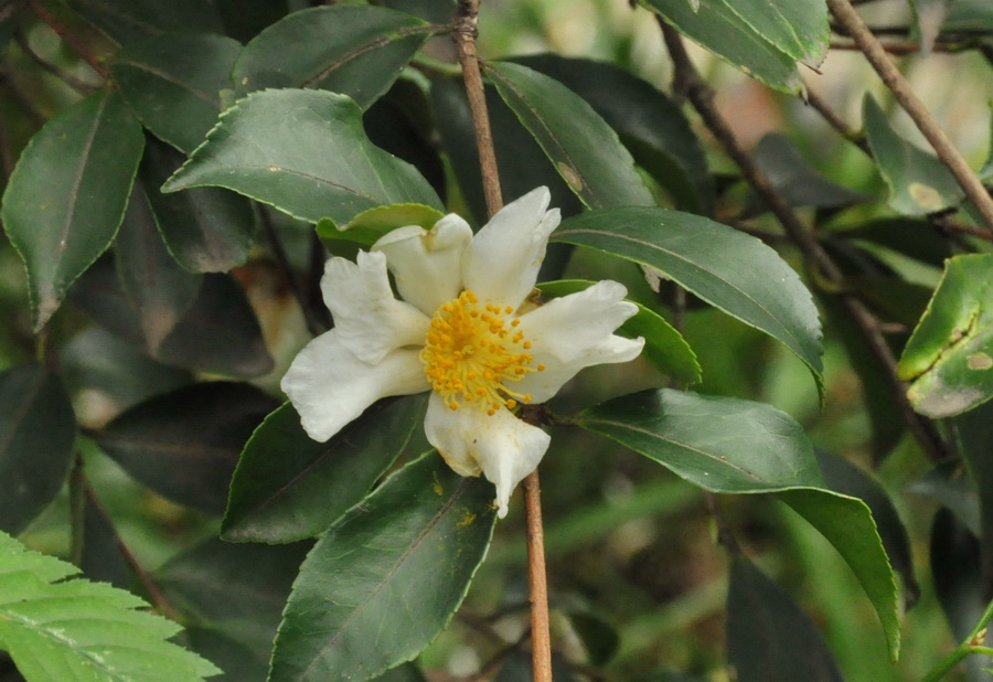 Ветвь с цветком и плодами. Китай, провинция Цзянсу, окр. г. Нанкин, парковый комплекс у подножия Пурпурных гор, озеленение. 09.11.2015.