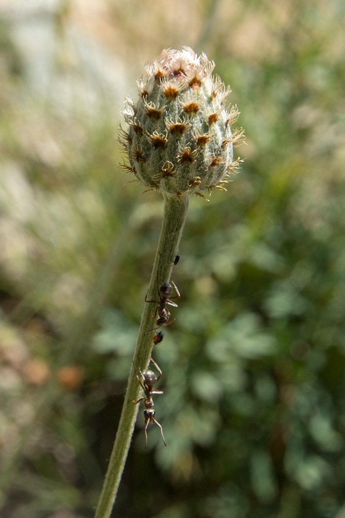 Верхушка побега с нераскрывшимся соцветием и пасущими тлю муравьями. Краснодарский край, Кавказский биосферный заповедник, долина р. Малая Лаба, на скале. 18.07.2021.