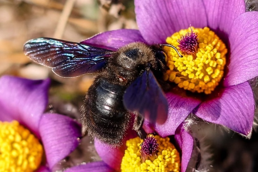 Зацветающие растения с питающейся пчелой Xylocopa violacea. Крым, Севастополь, окр. с. Терновка, скалы Кара-Коба. 27.02.2022.