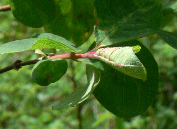 Из "лысых" жимолостей на Урале татарская и алтайская. Вроде остатки прилистников сросшихся (или из чего там эти утолщения в узлах у алтайской?) видны... |
