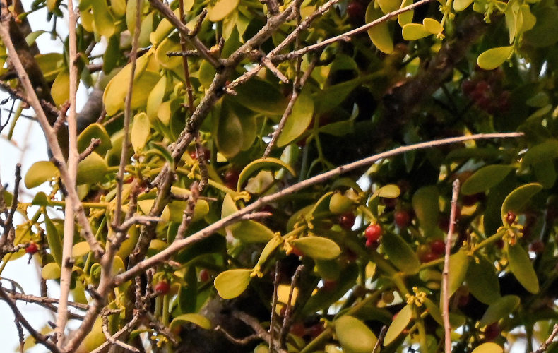 Плодоносящее растение на ветвях дерева. Марокко, обл. Танжер — Тетуан — Эль-Хосейма, хр. Эр-Риф, окр. г. Шефшауэн, ≈ 600 м н.у.м., подножие каменистого склона. 05.01.2023.