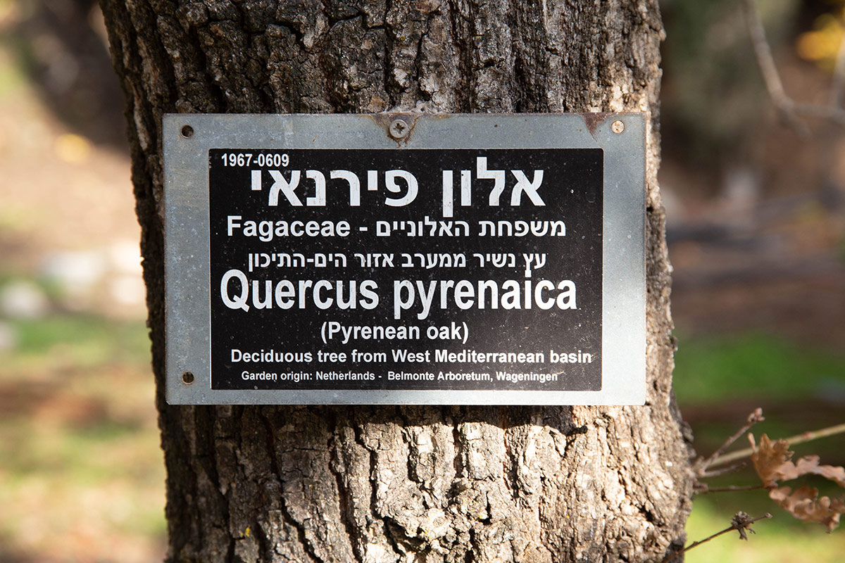 Верхушка веточки с листьями в осенней окраске. Израиль, г. Иерусалим, ботанический сад университета. 30.11.2022.