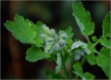 Бутонизирующее соцветие и листья на верхушке побега с каплями росы. Московская обл., Раменский р-н, окр. дер. Хрипань, садовый участок. 01.05.2023.