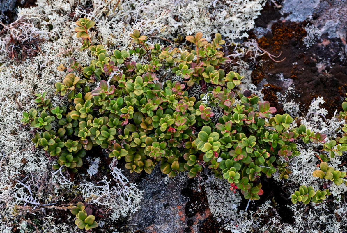 Отцветающие растения на поросшем лишайниками камне. Красноярский край, Таймырский Долгано-Ненецкий р-н, плато Путорана, долина р. Иркингда, лишайниковая тундра. 23.07.2023.