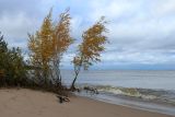 Растения с листвой в осенней окраске, подмытые штормом. Ленинградская обл., окр. пос. Большая Ижора, берег Финского залива, песчаный пляж. 15.10.2023.