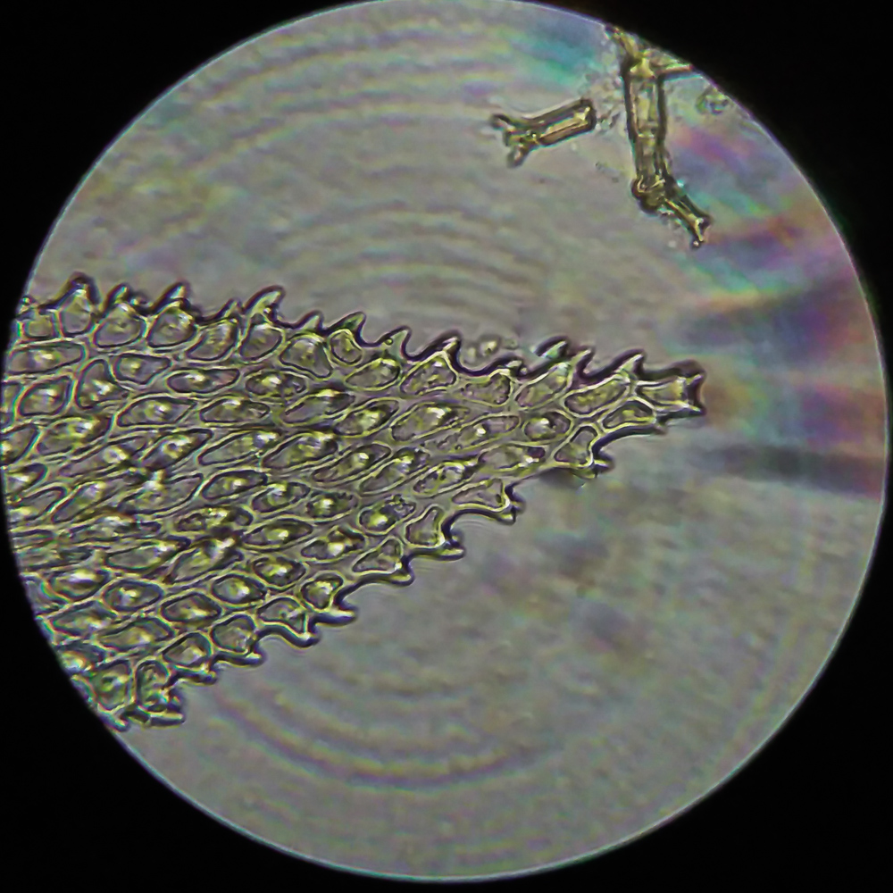 Верхняя часть листа веточки первого порядка с папиллозной верхушечной клеткой (характерная особенность вида) под микроскопом (640×). Свердловская обл., окр. г. Заречный, Черемшанское болото, на почве. 16.10.2023.