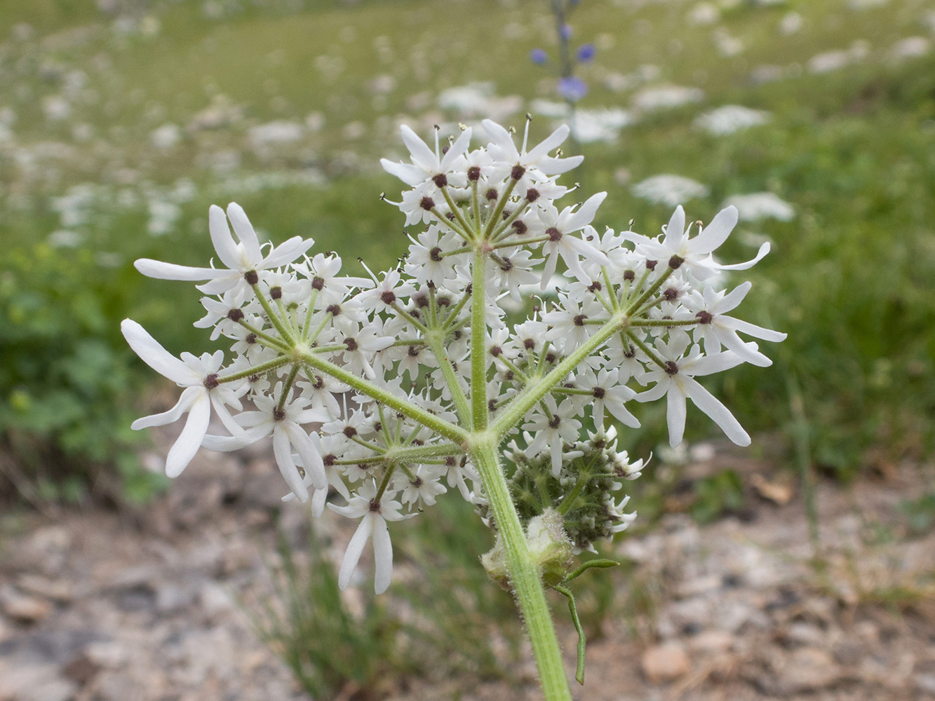 Верхушка побега с соцветием с цветками и завязавшимися плодами. Карачаево-Черкесия, Урупский р-н, хр. Загедан, долина Ацгарских озёр, ≈ 2500 м н.у.м., морена, альпийский луг. 09.08.2023.
