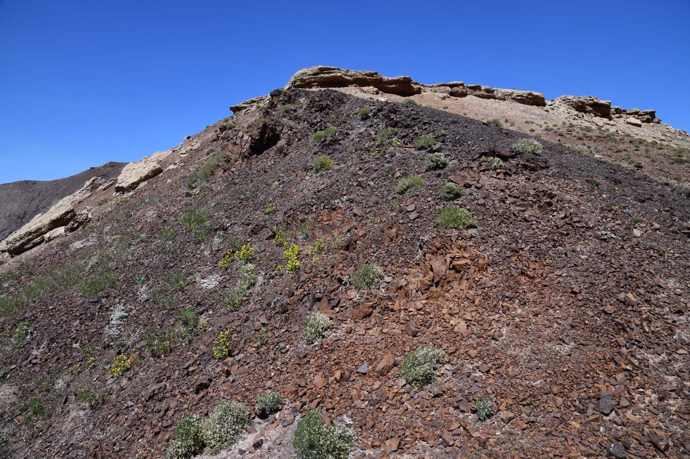 Цветущее растение. Казахстан, Алматинская обл., горы Богуты, кальдера палеовулкана Бетпак, песчаник гранулообразной формы на вершине горы, накрывающий вулканические пестроцветы. 8 мая 2024 г.