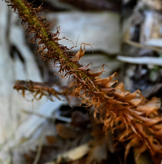 Верхняя половина вайи с сорусами (вид на абаксиальную поверхность). Курильские о-ва, о-в Итуруп, вулкан Баранского, опушка смешанного леса, окраина зарослей Sasa, поросший мхами участок склона. 24.08.2023.