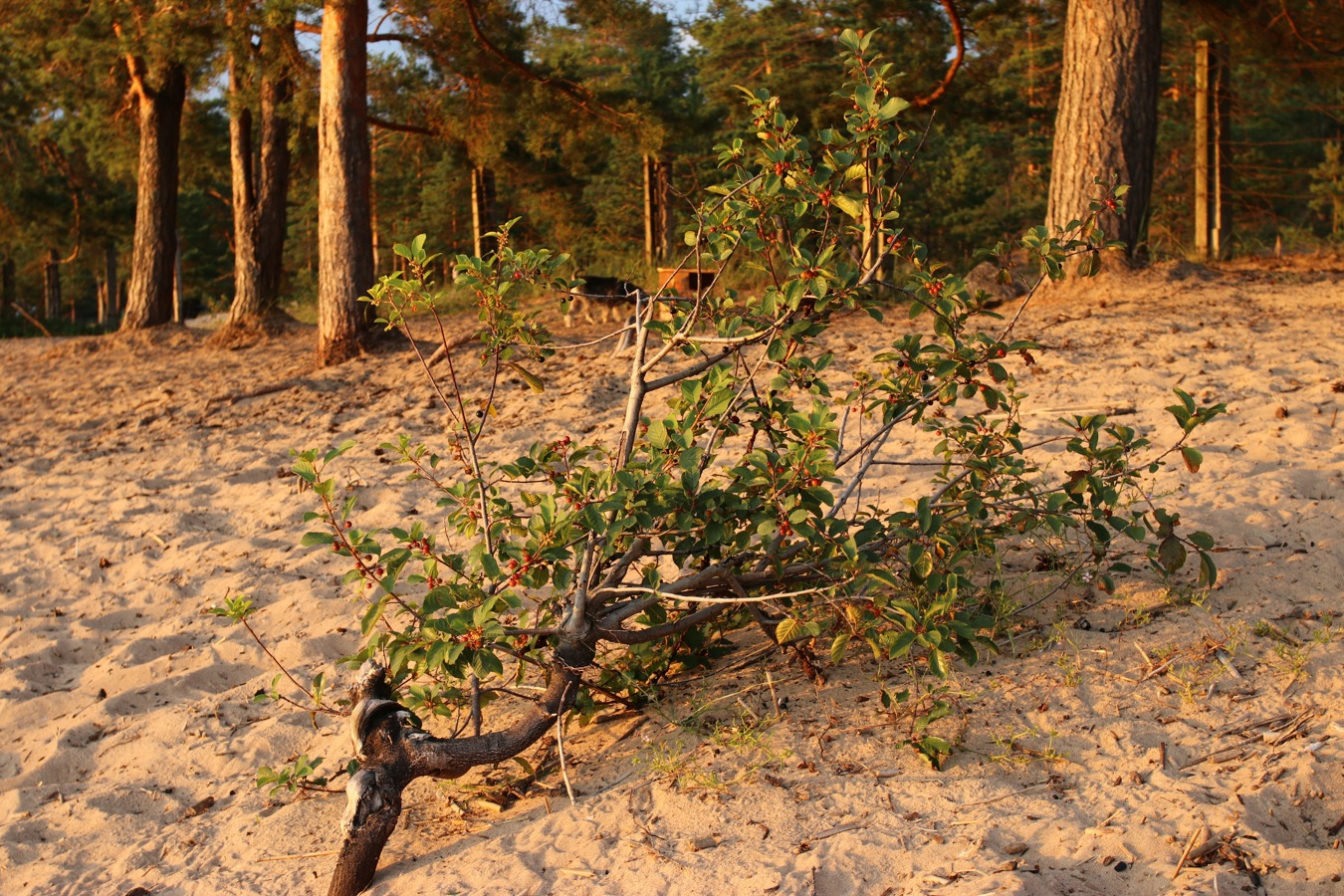 Сильно и многократно повреждённое растение с созревающими плодами в закатном освещении. Ленинградская обл., Ломоносовский р-н, окр. дер. Шепелёво, Батарейная бухта, фронтальная часть песчаного берегового вала, опушка разреженного сосняка. 08.08.2024.