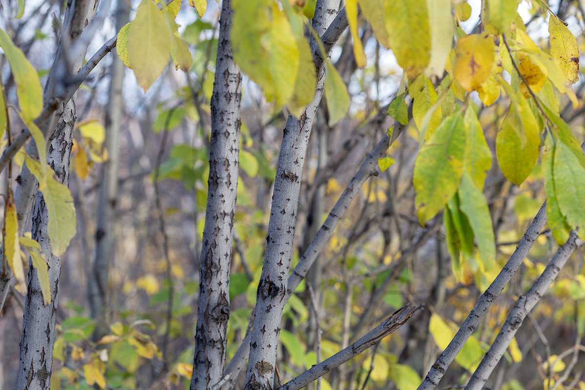 Побег с листьями в осенней окраске. Мурманск, Октябрьский р-н, окр. оз. Среднее, смешанный лес с доминированием Betula. 30.09.2024.