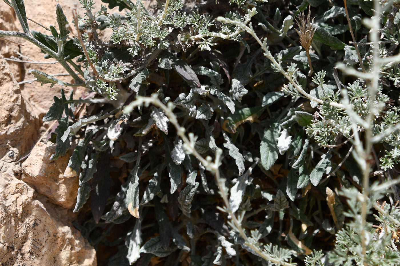 Цветущее растение (в сообществе с Artemisia). Таджикистан, Хатлонская обл., Кабодиёнский р-н, хр. Актау, горы Ходжа-Казиан (locus classicus), ур. Тахти-Сангин, сухой каменистый склон. 14 апреля 2025 г.