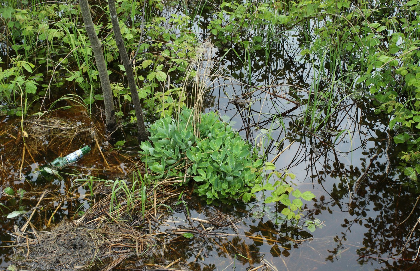 Вегетирующее растение в сообществе с Rubus caesius и злаками в подтопленной дождями низинке. Беларусь, Витебская обл., пос. Езерище, используемая как стихийная свалка старая выемка грунта среди суходольного луга. 02.06.2025.