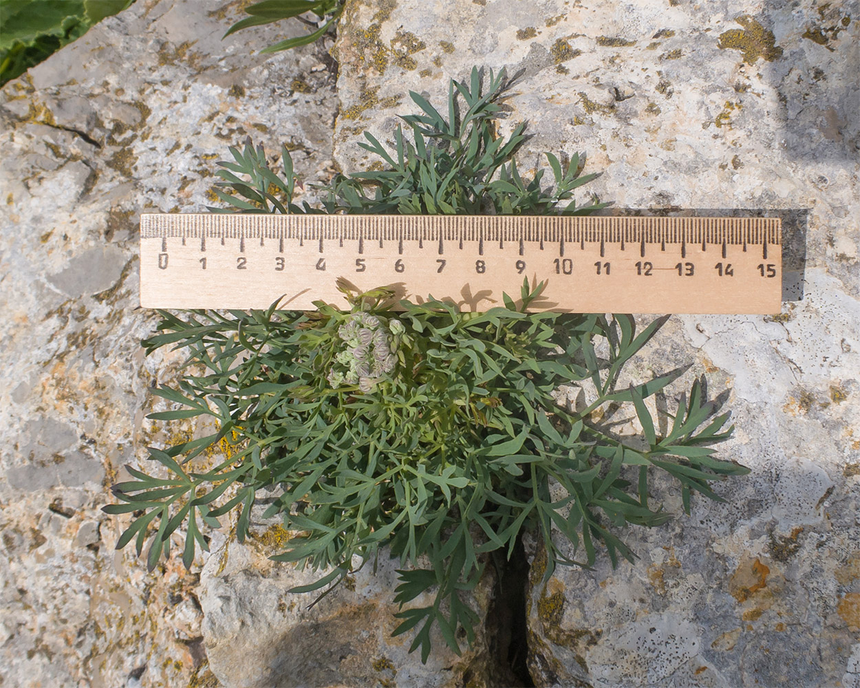 Вегетирующее растение с развивающимся генеративным побегом. Карачаево-Черкесия, Зеленчукский р-н, гора Джангур, ≈ 1500 м н.у.м., в расщелине известняковой скалы. 04.06.2025.
