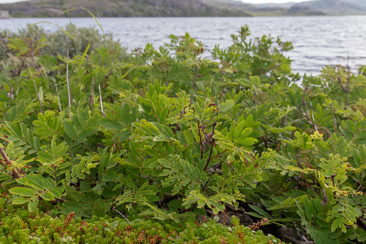 Верхушка ветки с соплодием с незрелыми плодами. Мурманская обл., Кольский р-н, окр. с. Териберка, природный парк «Териберка», берег Секретерского озера, у воды. 02.08.2025.