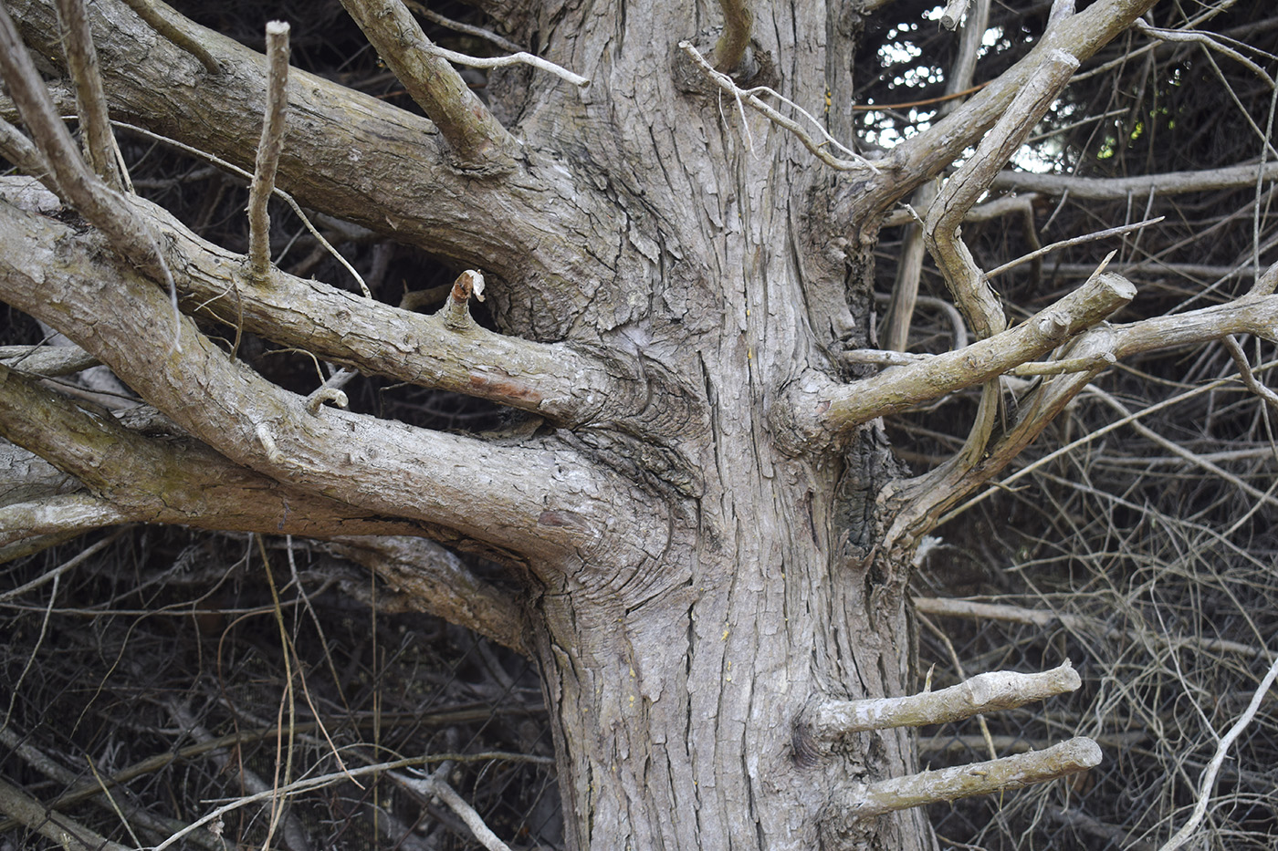 Кое как до опоры докопалась (фото 0712). Два сухих ствола там впритирку. Опознать их не могу. Кора вроде на дуб похожа, но вот такое низкое ветвление почти под прямым углом как-то никак у меня не ассоциируется с Quercus ilex. Проверила стволы кипарисов из старой живой изгороди рядом — ветвление похожее, растут впритык что нормально для изгородей, но кора другая (фото 0730).И под этой цветущей копной погребена некая опора, возможно дуб Quercus ilex был |