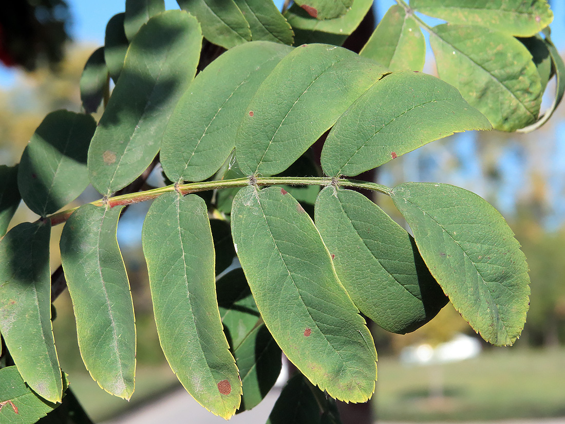 | Dmitry Oreshkin | Какая-то она странная для Sorbus aucuparia. Листочки туповатые, ближе к основанию выглядят гладкими. Уж не гибрид ли? |