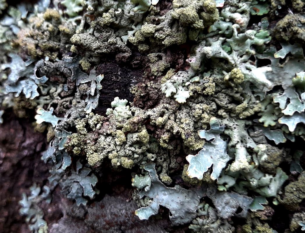 Талломы с соредиями в сообществе Hypogymnia physodes, Parmelia sulcata. Санкт-Петербург, Курортный р-н, ПП «Комаровский берег», на стволе дерева. 01.11.2025.