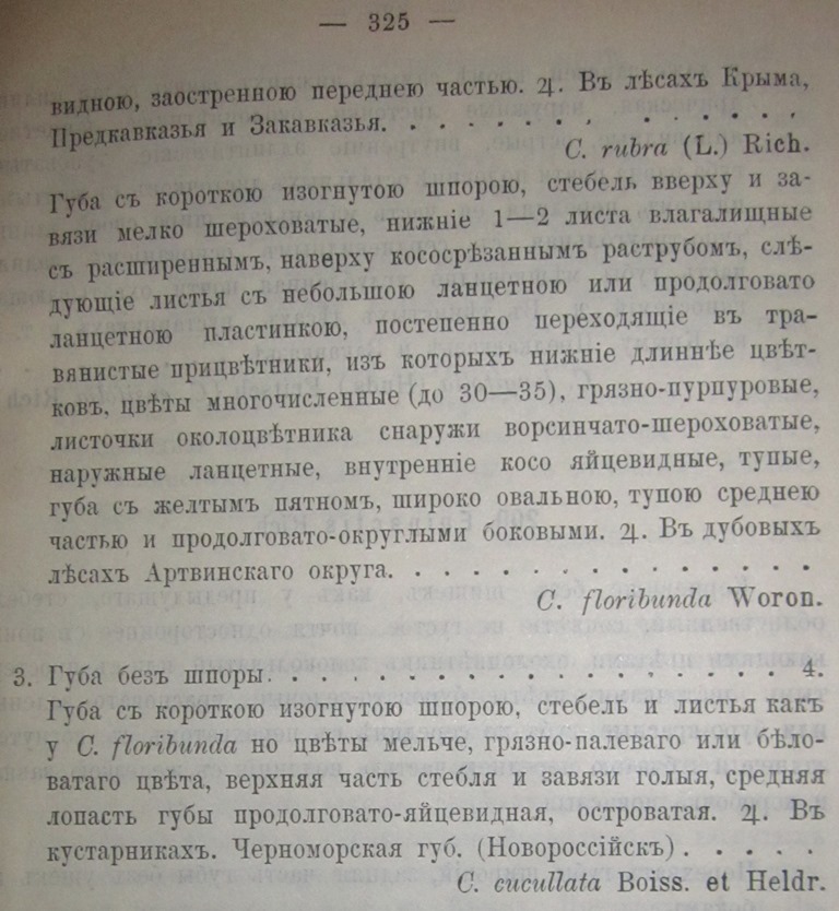 | Alexander Fateryga | Недавно задался этим вопросом и тоже ничего не понял. У Черепанова, Вахрамеевой с соавторами и в КК РФ это отдельный вид - C. floribunda. Конспект флоры Кавказа (2012), Delforge (2006, 2014), The Plant List и Euro+Med PlantBase говорят нам, что это синоним C. kurdica, у которого, однако, цветки красные. По Зернову это C. cucullta, который, согласно Delforge, однако, известен только с Крита. Во Флоре СССР это C. epipactoides, который по картинкам в Delforge наиболее похож, кстати, на наш C. floribunda, представленный на сайте. Кстати, Delforge для бывшего СССР ни указывает ни одного из признаваемых им видов этой группы (C. kurdica=C. floribunda, C. cucullata, C. epipactoides).