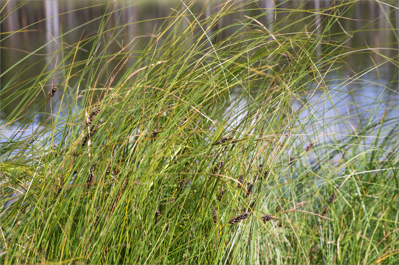Верхушка побега с соплодиями, поражёнными головнёвыми грибами, и отцветшими мужскими соцветиями. Карелия, восточный берег оз. Топозеро, низинное болото вблизи песчаного пляжа. 28.07.2025.