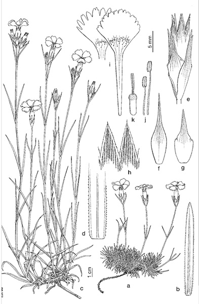 Lám. 124.-Dianthus seguieri subsp. requienii, a-b) Prat de la Fontclareta, Matagalis, Montseny, Barcelona-Gerona (BCC 333); c-k) entre Beget y Oix, Gerona (BCC 197): a) hábito, planta de altitud; b) hoja; c) hábito nonnal; d) detalle de la parte basal de una hoja; e) cáliz con su calículo; f) bráctea calicular externa; g) bráctea calicular interna; h) dientes del cáliz; i) pétalos; j) estambres; k) pistilo.