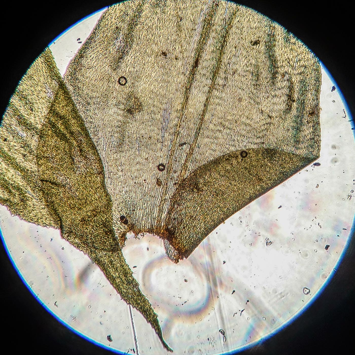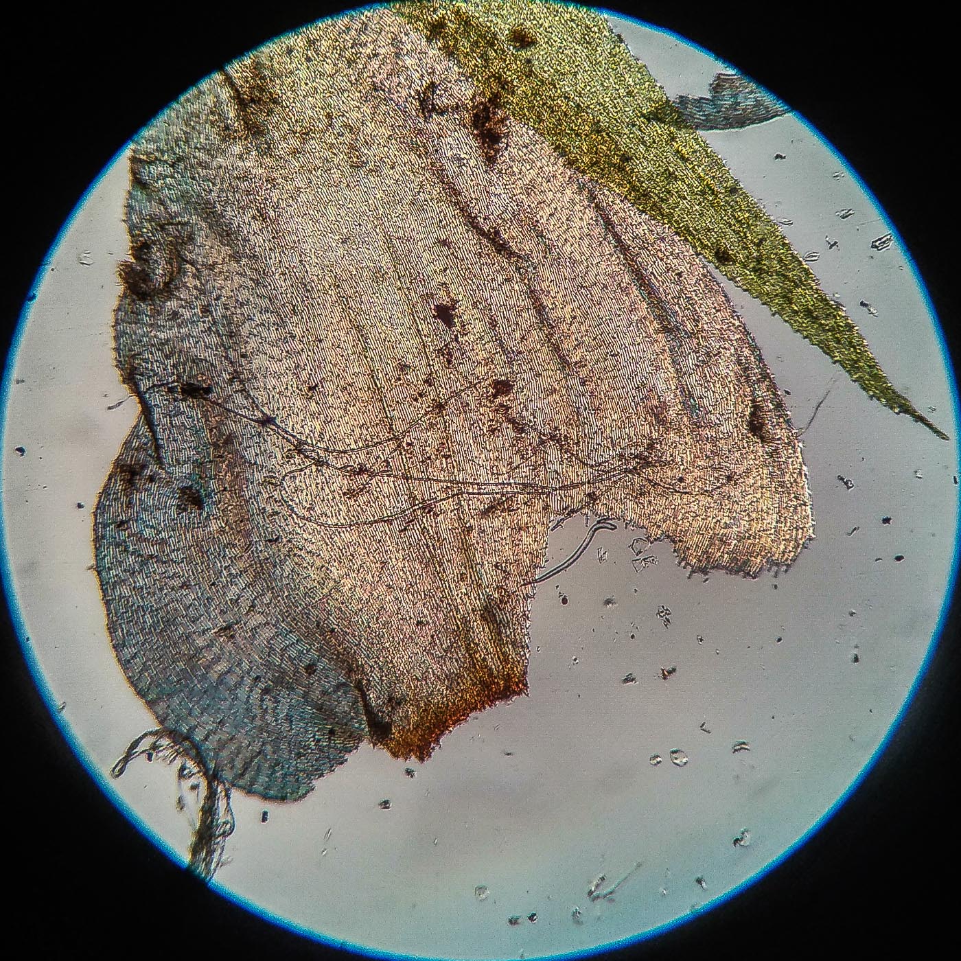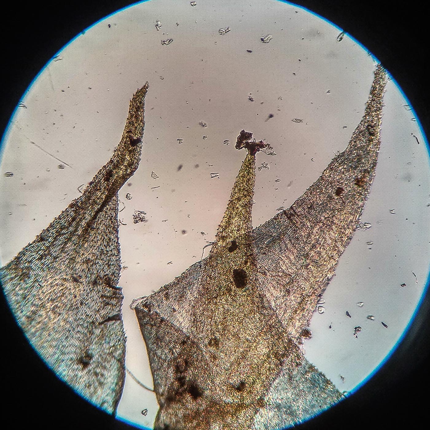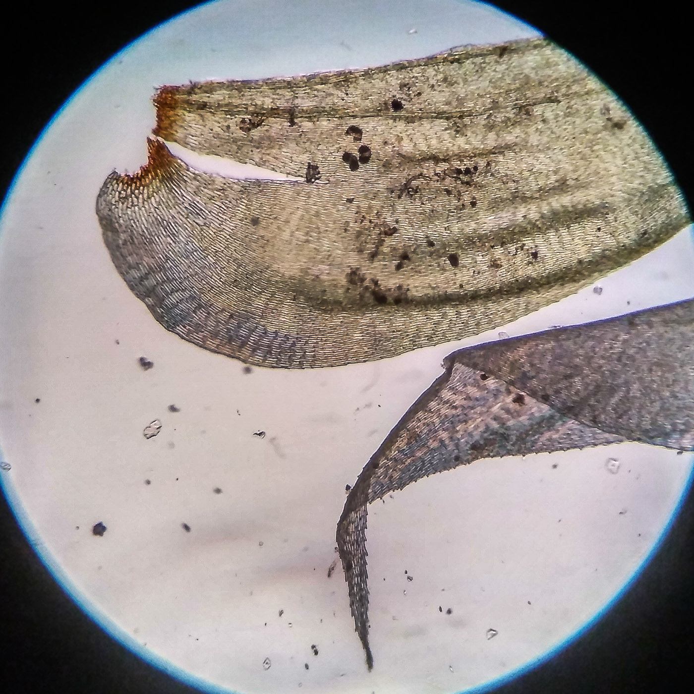 | Aleksandr Kozlovskikh | Довольно крупный мох, нас. зелёный, дерновинки обширные рыхлые, неправильно ветвящийся, всесторонне густо облиственный. Веточки к верхушке утончаются, стеблевые листья из широко яйцевидного основания быстро сужены в назад отогнутую, ланцетную верхушку. ( У Rhytidiadelphus subpinnatus стеблевые листья в основании широко сердцевидно-треугольные).