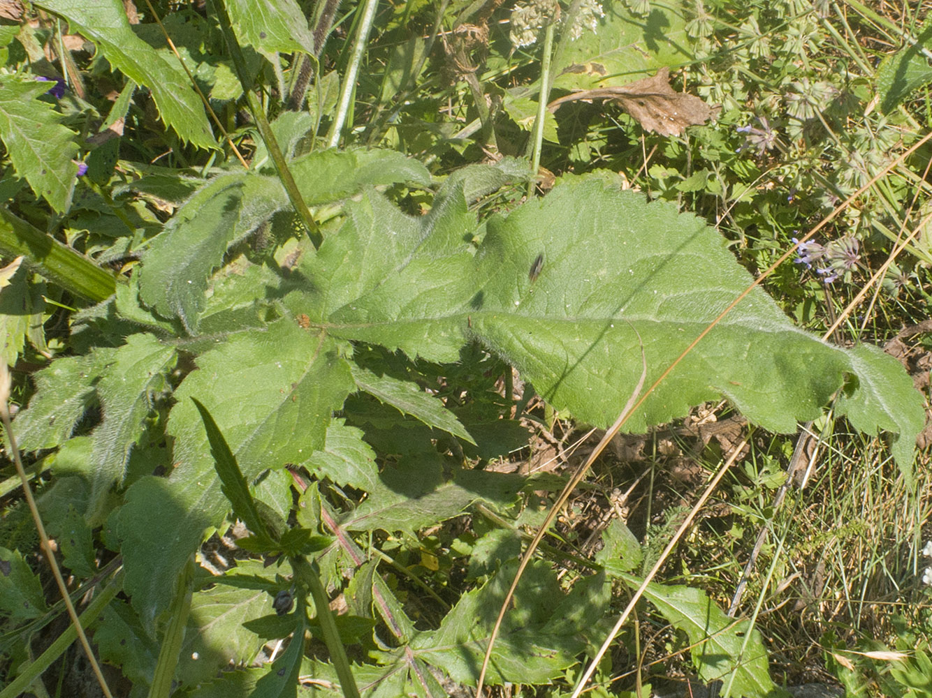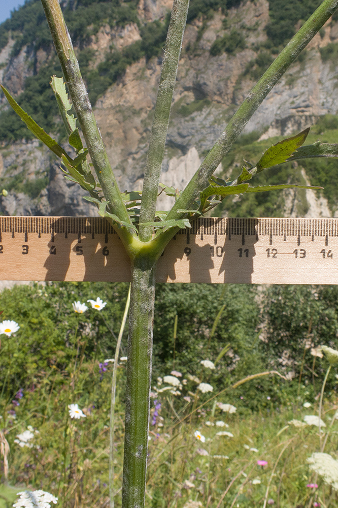 Верхушка побега с соцветием (вид со стороны обёртки). Кабардино-Балкария, Лескенский р-н, Хазнидонская теснина, ≈ 1700 м н.у.м., разнотравный лужок в верхней части травянистого склона к реке. 31.07.2025.