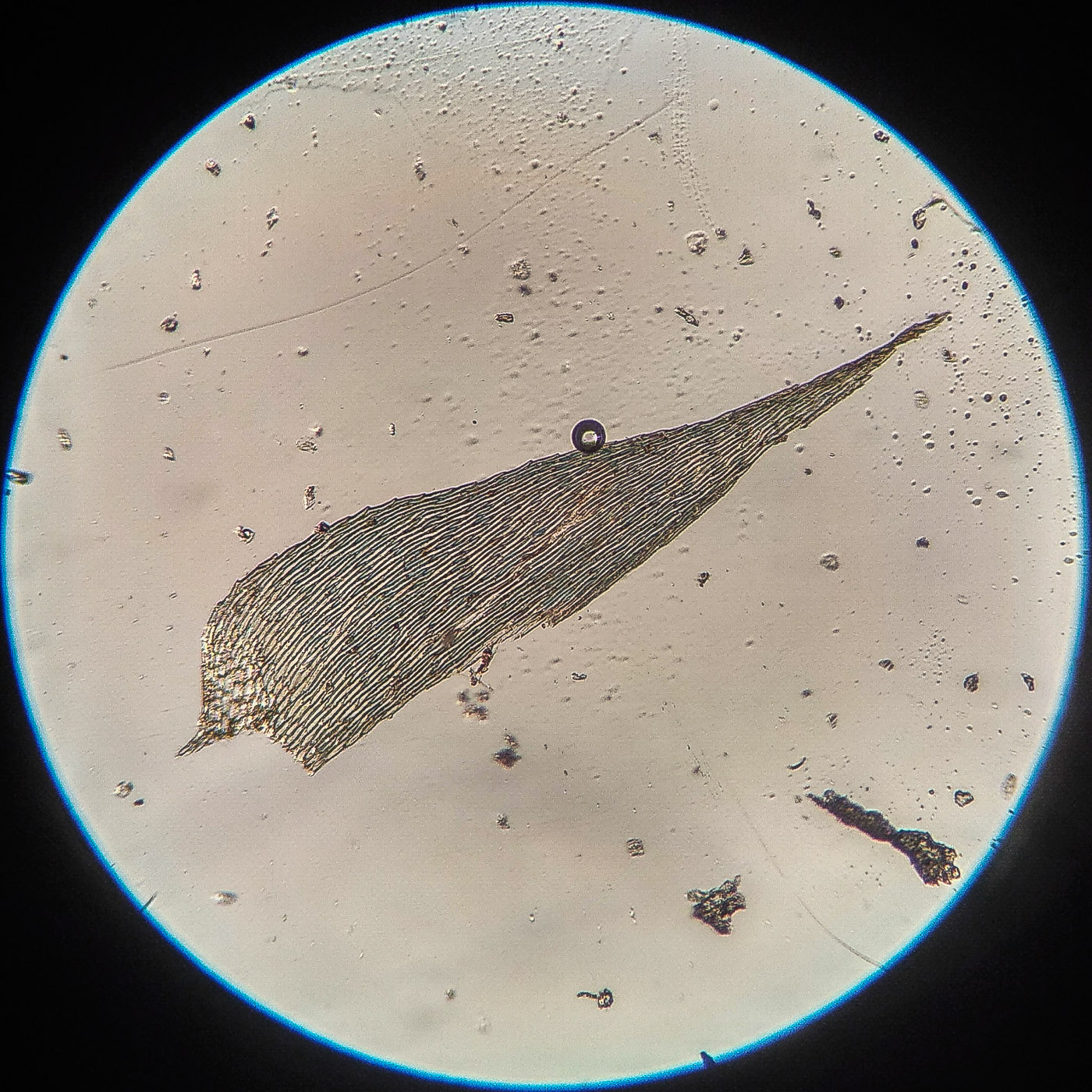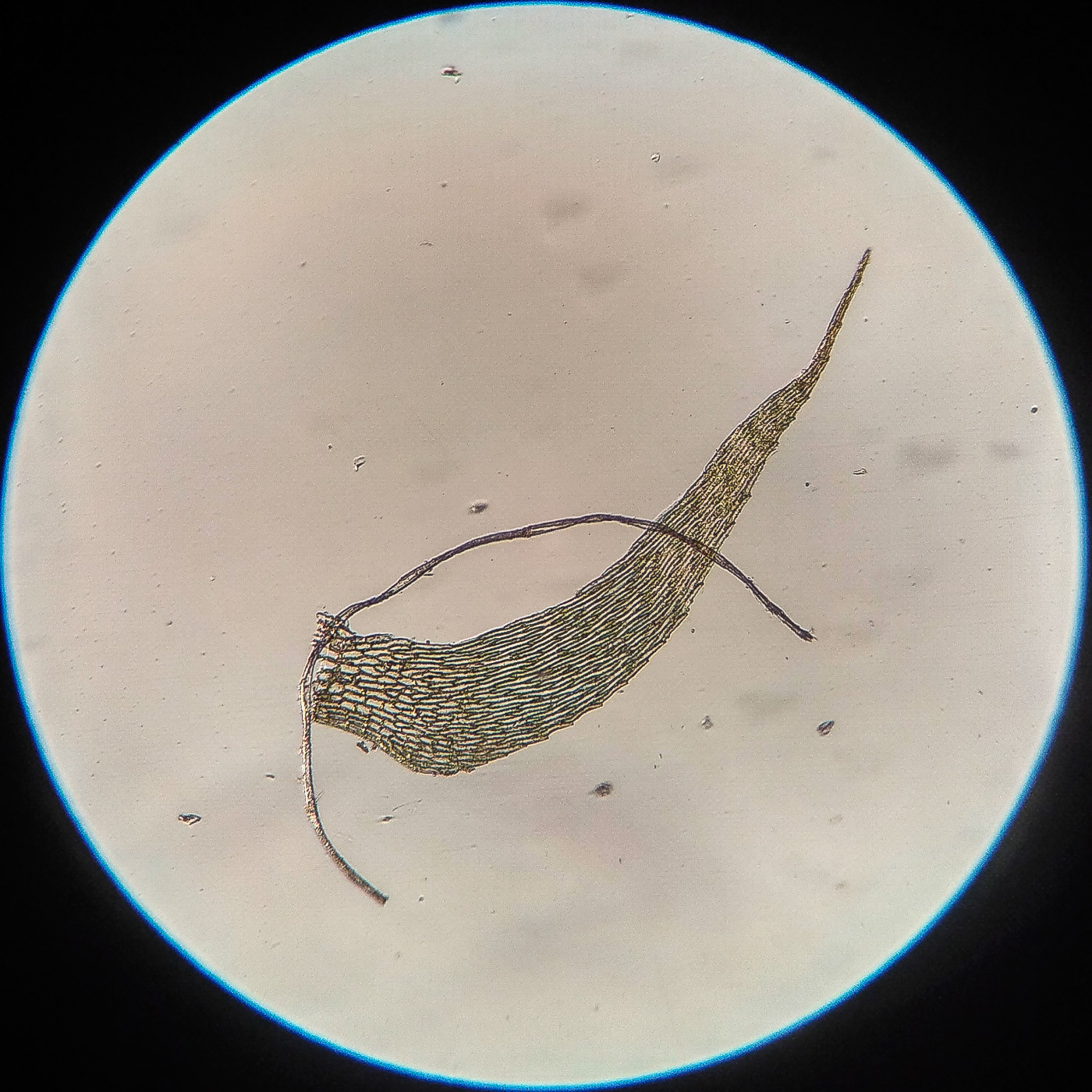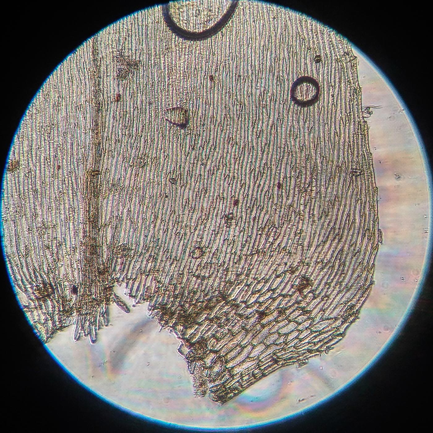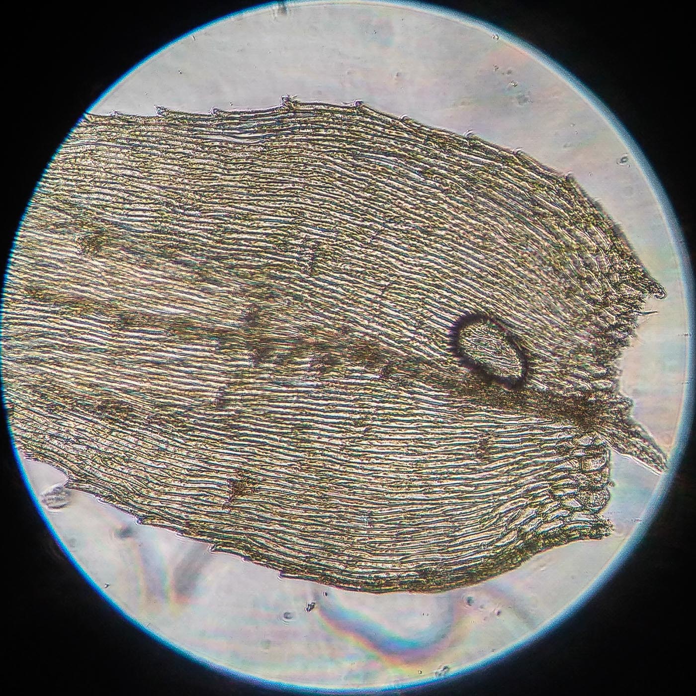 * клетки в середине листа линейные, извилистые, б.м толстостенные, к основанию постепенно более короткие и широкие, образующие б.м. прозрачную зону во всю ширину листа почти до жилки;