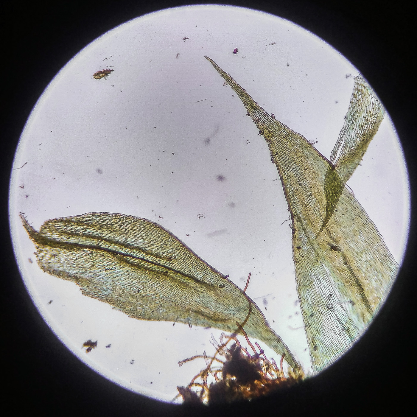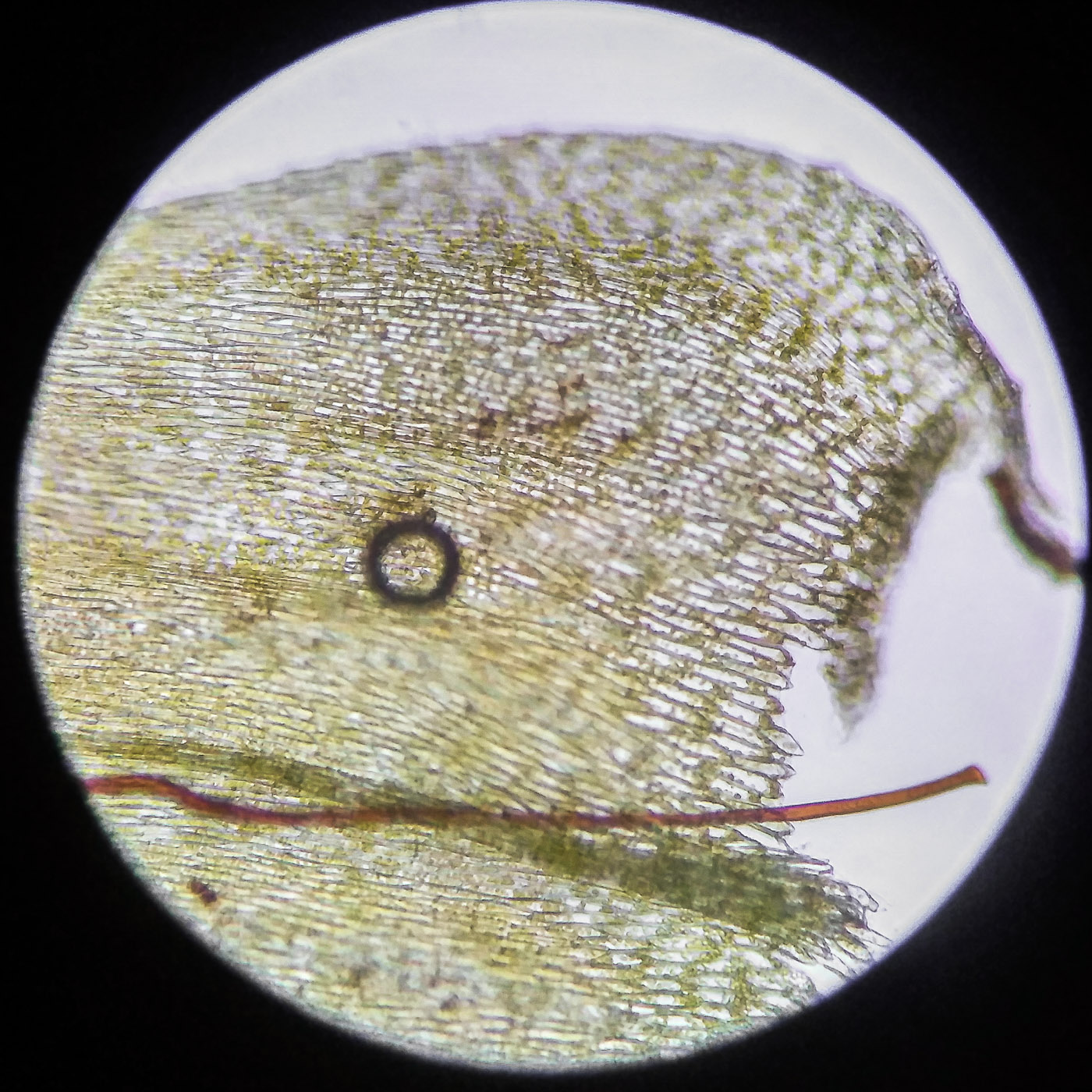 * клетки в середине листа линейные, к основанию более широкие, на изгибе основания тонкостенные клетки образуют б.м. крупную, хорошо заметную группу, не достигающую края листа;