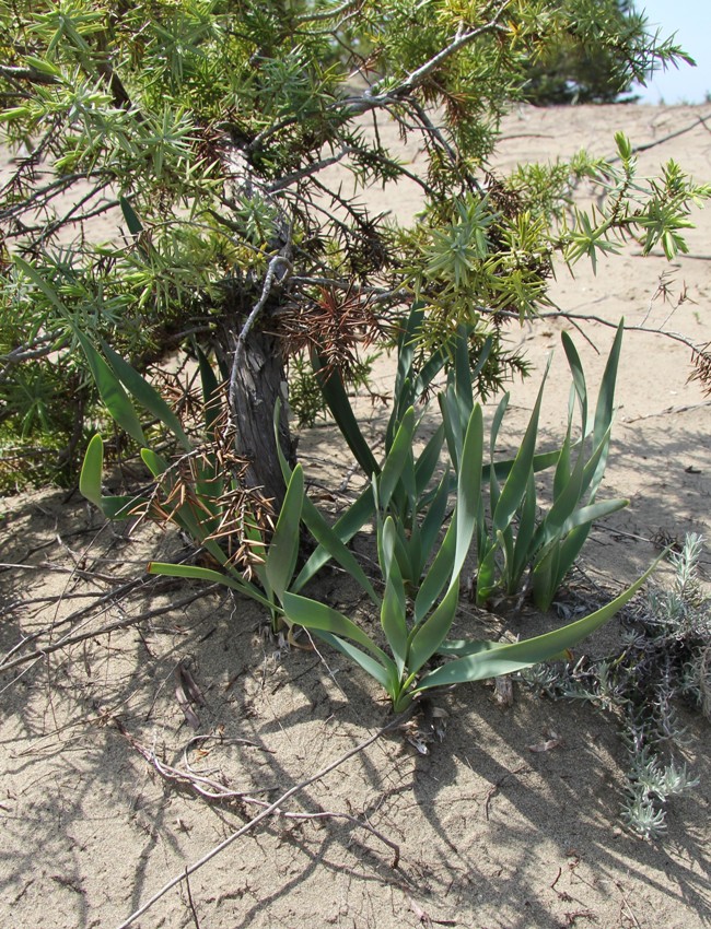 Растения под кроной можжевельника на песчаном пляже. Италия, Тоскана, парк Маремма. 12.04.2011.