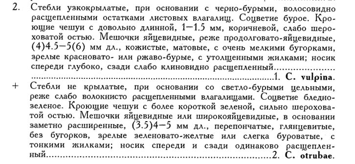 Стебли узкокрылатые, у основания с черно-бурыми, волосовидно расщепленными остатками листовых влагалищ. Соцветие бурое. Кроющие чешуи с длинными (1—1.5 мм дл.), коричневыми, слабо шероховатыми остями. Мешочки яйцевидные, реже продолговато-яйцевидные, (4) 4.5—5 (6) мм дл., кожистые, матовые, с мельчайшими бугорками, зрелые — красновато- или ржаво-бурые, с утопщенными носилками; носик спереди глубоко, сзади слабо клиновидно расщепленный................. 103. С. vulpina. Стебли не крылатые, у основания со светло-бурыми, цельными, реже слабо волокнисто расщепленными влагалищами. Соцветие бледно-зеленое. Кроющие чешуи с более короткими, зелеными, сильно шероховатыми остями. Мешочки яйцевидные или широко-яйцевидные, с широкоокруглым основанием, (3.5) 4—5 мм дл., перепончатые, глянцевитые, без бугорков, зрелые — зеленовато-желтые или слегка буроватые, с тонкими жилками; носик спереди и сзади одинаково расщепленный............ 104. С. otrubae. |