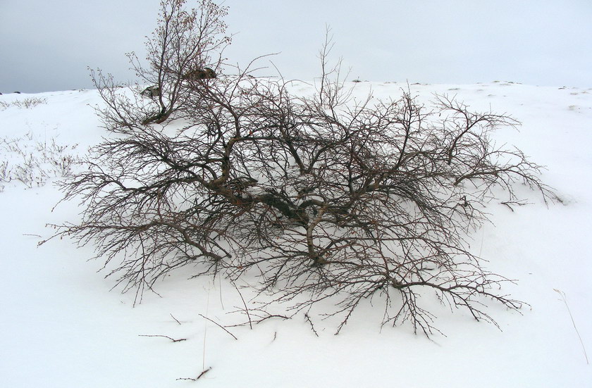 "обнюхал" ... дерево. Сложилось убеждение, что главный корневой ствол один, и он скрыт в насыпном грунте. Ветви, которые от него отходят, сначала тоже скрыты в насыпи и в плотном слое вороничника, прорезаясь на поверхность молодым подростом. Если кто обратил внимание, я сегодня разместил фото стелящейся карликовой березки B. nana точно такой же жизненной формы с той же самой обочины, но на 20 м подальше. Еще засушил для определения плодоносную веточку длиной 15 см с целой дюжиной серёжек и молодыми вегетативными побегами..